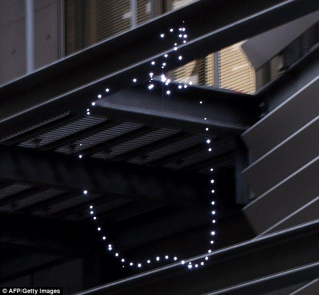 (空中でたくさんの火花を発光させてドットパターンの映像にしている)