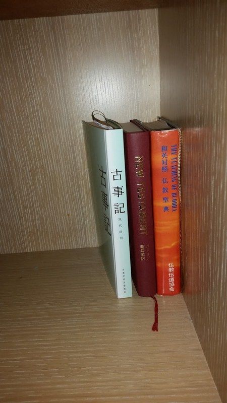 日本だと仏教の教本と私には読めなかった本の隣に新約聖書が置かれている。