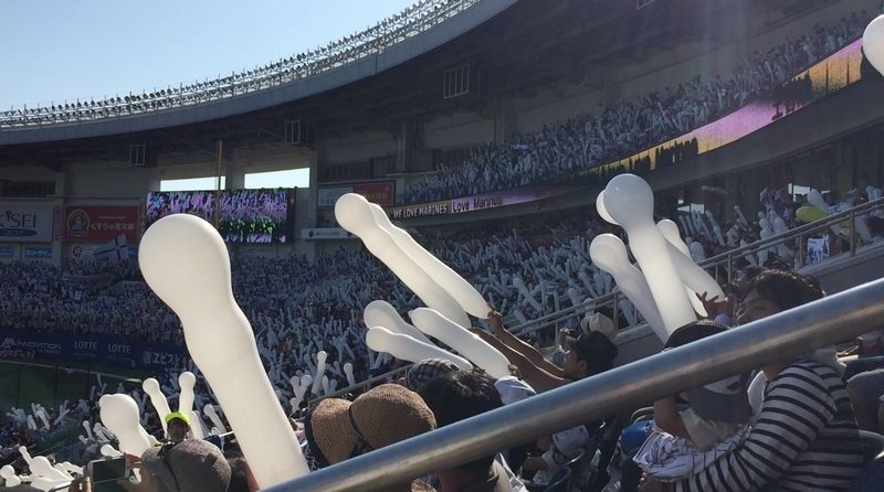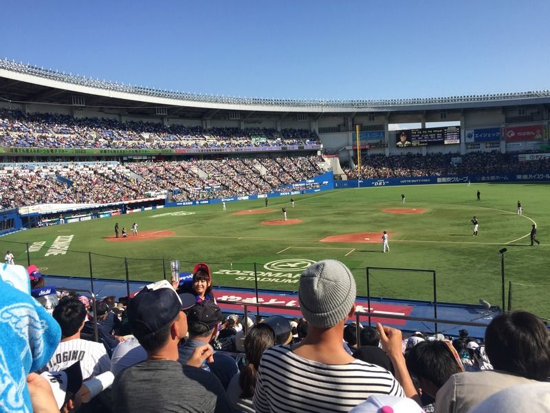 日本の野球の雰囲気はアメリカの大学フットボールに似ててファンの熱意も凄いしゲームの間にチャントや応援もあり、チームのユニフォームを着てるファンも多くて、7回には風船を上げたりするんだ。