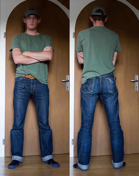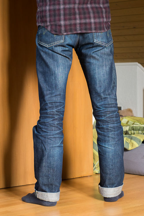 エドウィンのレッドリステッドセルビッジはレインボーセルビッジよりも色落ちが遅くて落ち方も違う(垂直方向の色落ちが少ない)みたいだけど、スタート時の見栄えは好きかな。