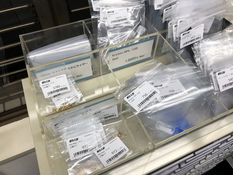1.60%キーボードケース2.ホットスワップソケット、グリス(クライトックス)3.JTKのキーキャップ4.日本の自作キーボードサークルがデザインしたキーボードキット(Crkbd、Lily58、Helix、Ergo42、Ergo Dash等々)5.ショップオリジナルのキーボードカバー。レザーは(Felixに)よく似合う。6.日本語の自作キーボード同人誌とCherry MXの開発キット7.SP(※アメリカのSignature Plastics社)のキーキャップ8.9.GMK(※ドイツのメーカー)のキーキャップ10.DSA、MAXKEYのキーキャップ11.HHKBレイアウトのキーキャップとKailh Pocket!(Kailhのメカニカルキーを使った電卓で、凄く珍しい)12.店内でキーボードを組み立てる事も出来る。1時間500円(※1月いっぱいは工作スペースを無料で使えるとの事)13.トテモカワイイimages credit:imgur.com