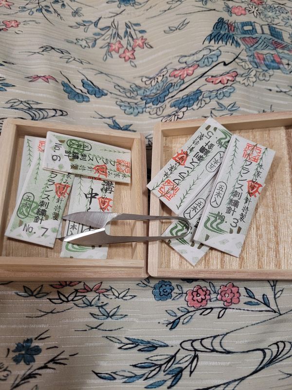 手作りの糸切狭と針、下にあるのは買ってきた着物image credit:reddit.com