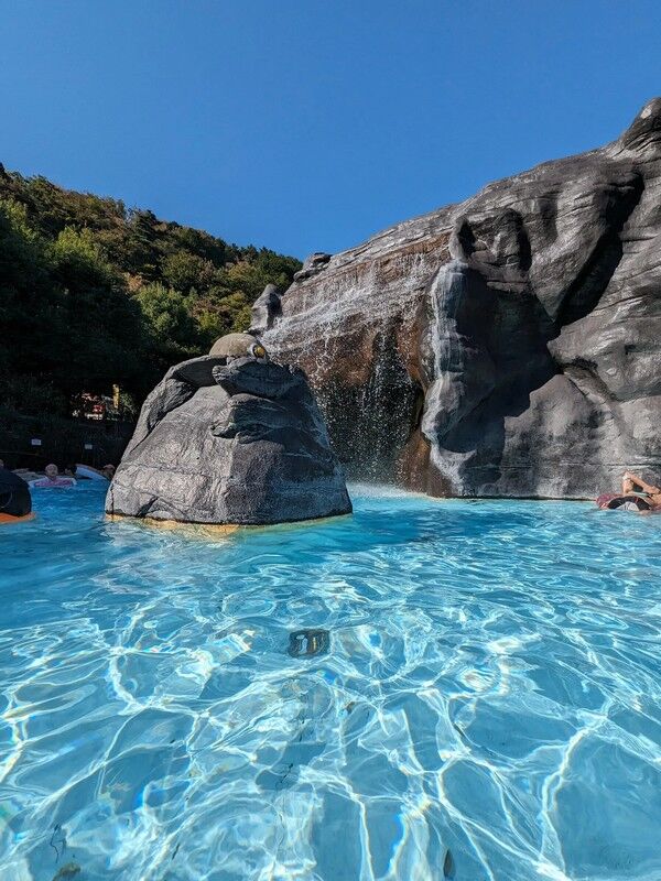 屋外にはウォータースライダー、洞窟、流れるプールもあって、屋内にはワイン風呂、コーヒー風呂など変わったお風呂がある。