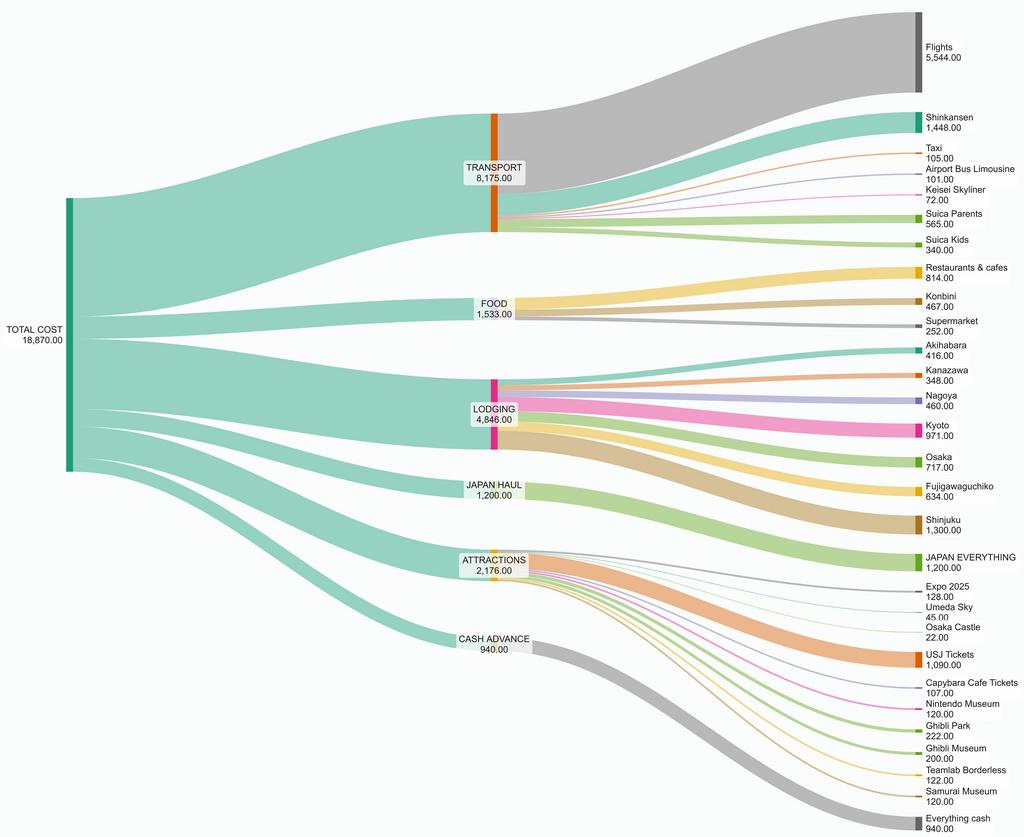 5月と6月に大人2人で24日間旅行して(東京、高山、金沢、京都、奈良、大阪)毎晩外食して万博のアトラクションも全部回ってきたけど合計4000ドルだったな。