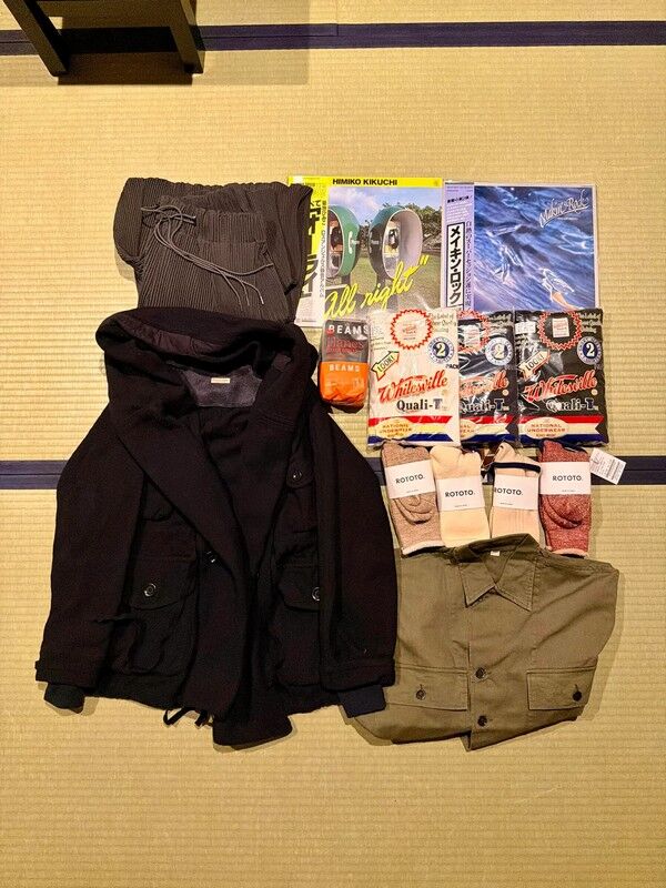 シアージ(※公式サイト)のプリーツパンツ、ホワイツビル(※公式サイト)の定番色のシャツ、ROTOTO(※日本の靴下メーカー:公式サイト)の靴下、Kapitalのリングコート(これが一番のお気に入りかも)、シービーズ(※公式サイト)のオーバーシャツ、日本のファンクのレコード。