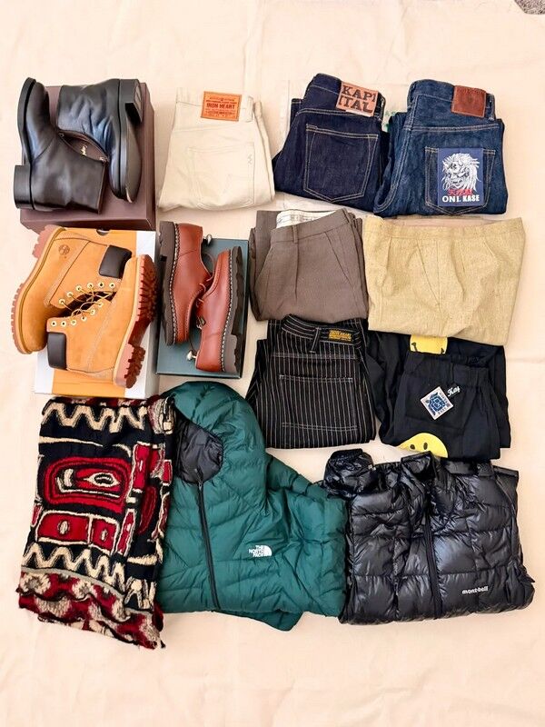 Kapital(※公式サイト)の茶芯ブーツ、パラブーツ(※フランスの靴メーカー:公式サイト)・ミカエル、ティンバーランド・クラシック、アイアンハート(※公式サイト)、Kapital、鬼デニムの色んなジーンズ、Kapitalのマフラー、2nd Streetで買ったノースフェイスとモンベルのダウンジャケット。