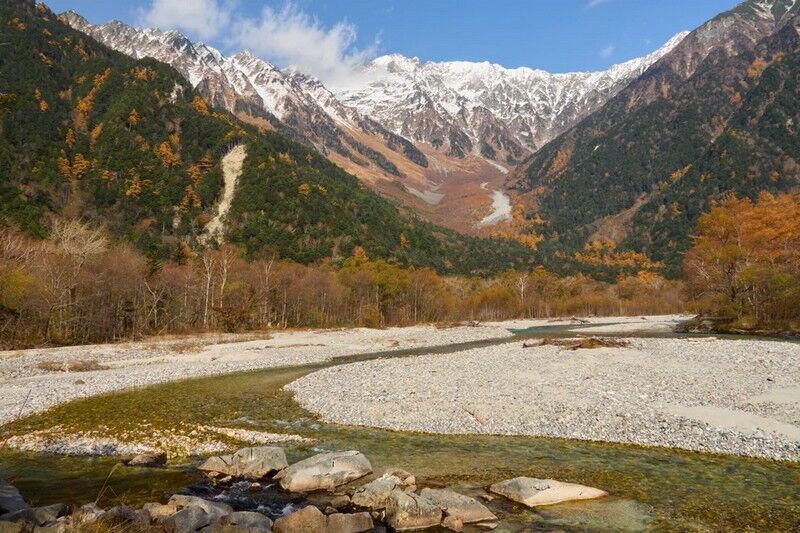 そして北アルプス南端の上高地、新穂高、平湯温泉などを訪れ、山々と紅葉、金色に染まったカラマツの対比を楽しむこともできる。