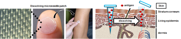 大阪大が先日発表した方法は生体分解性のヒアルロン酸で作ったマイクロニードルを用いており、ワクチンを含んだ微小な針の付いたパッチを皮膚に貼る事でワクチン接種する事が出来ます。